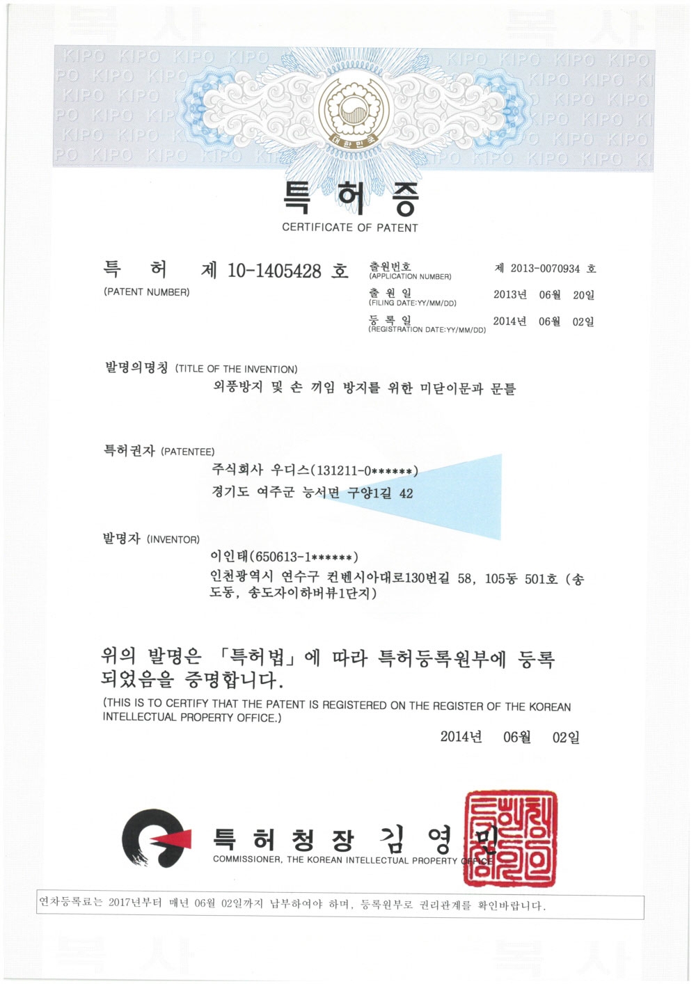[특허증] 외풍방지 및 손끼임 방지를 위한 미닫이문과 문틀
